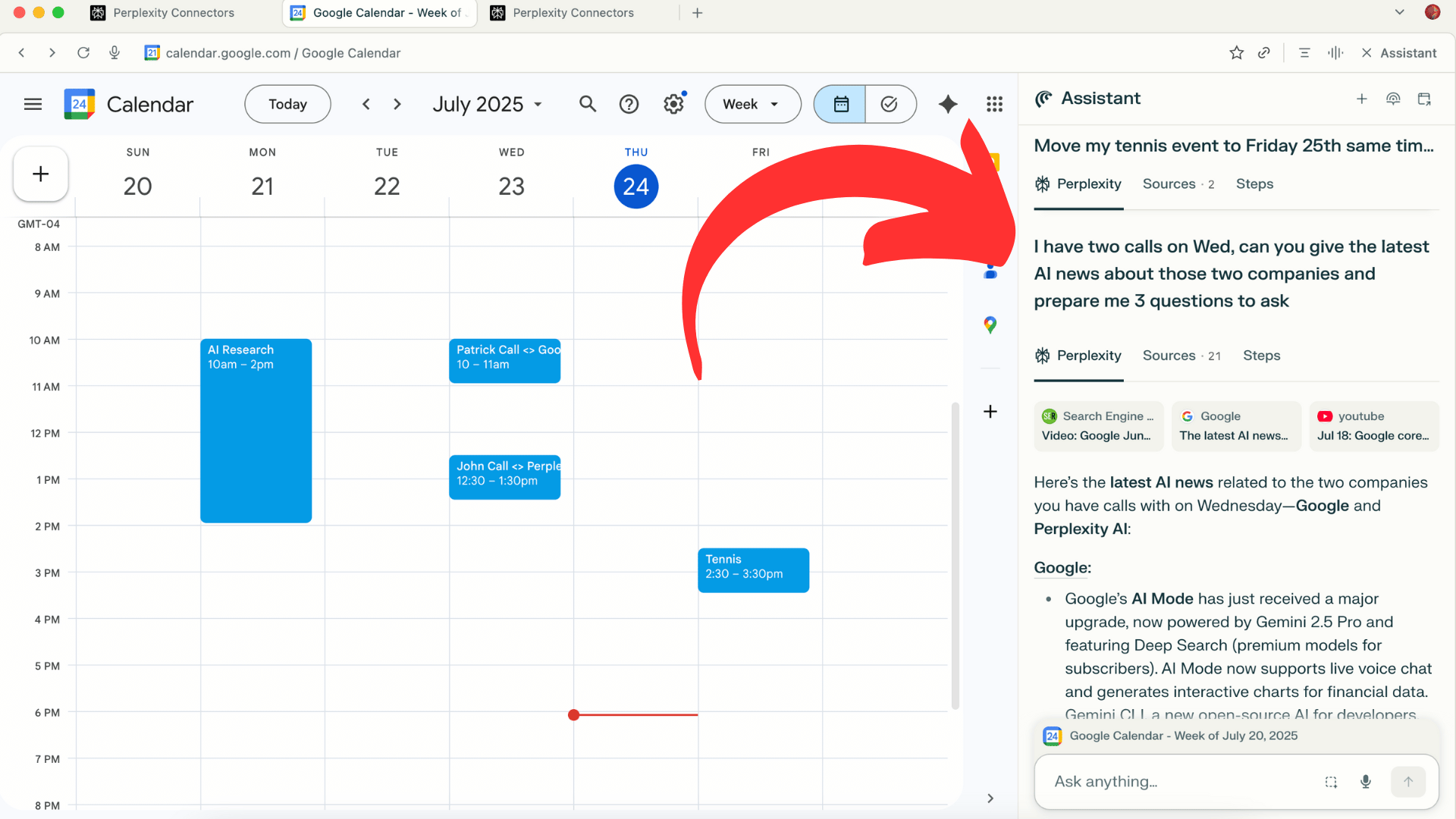 Research and prep questions: “I have two calls on Wed, can you give me the latest AI news about those two companies and prepare me 3 questions to ask”