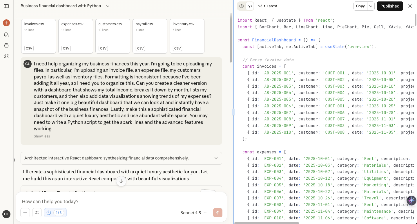 Upload your financial documents (revenue statements, invoices, expenses, inventory) and prompt Claude with what you want: your goal, file types, organization structure, and desired aesthetic