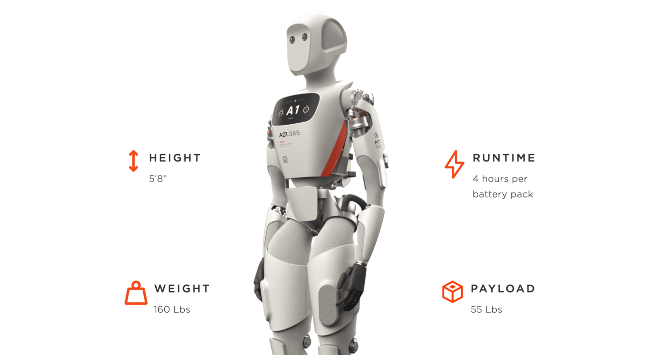 Apollo stands 5'8", weighs 160 pounds, and is designed for industrial tasks while safely working alongside humans.