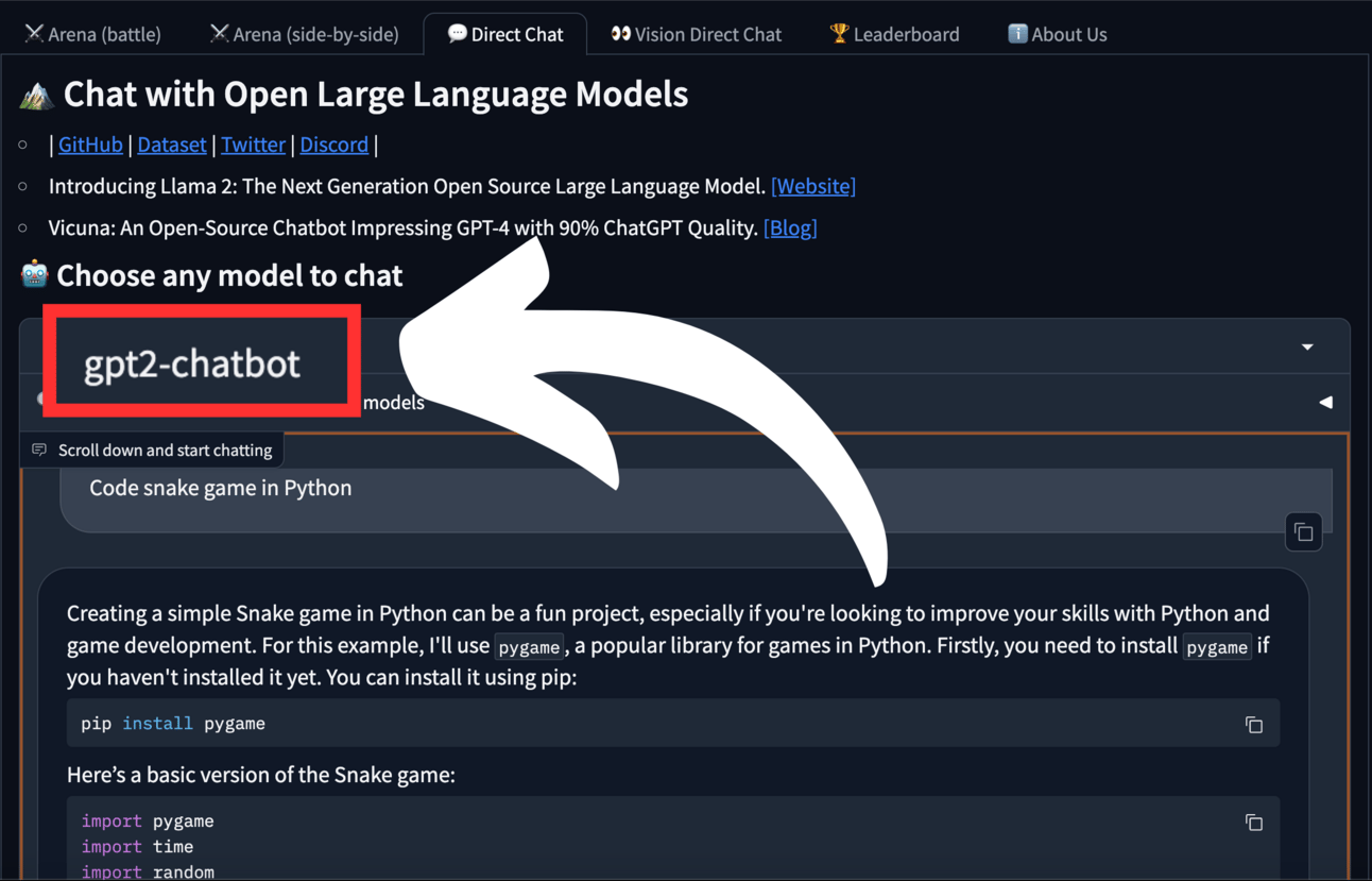 Select "gpt2-chatbot" from the dropdown menu labeled “Choose any model to chat.”