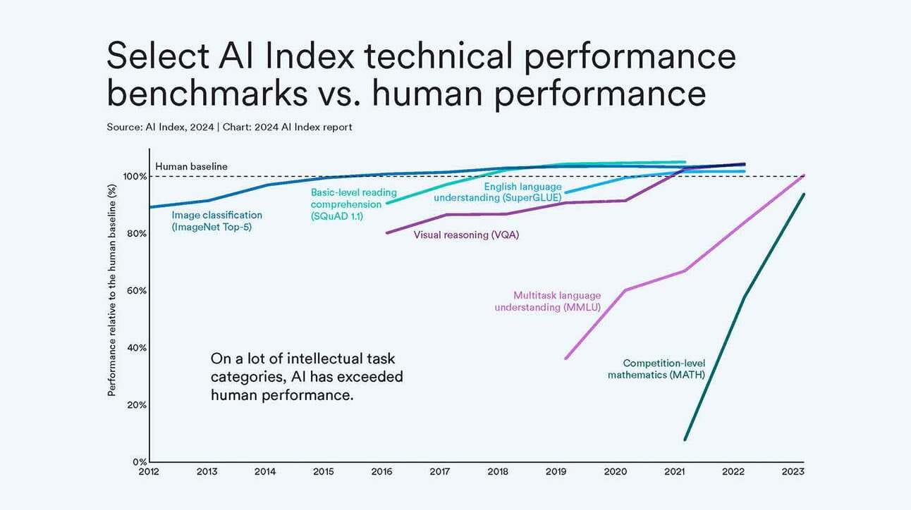 AI now exceeds human performance on benchmarks for tasks like image classification, reading comprehension, visual reasoning, and more.