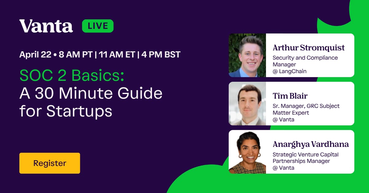 The Rundown: If customers, investors, or your sales team keep asking about SOC 2 and you haven't started yet, Vanta's upcoming live session on April 22 is designed to help you take the first step with confidence — all in just 30 minutes.