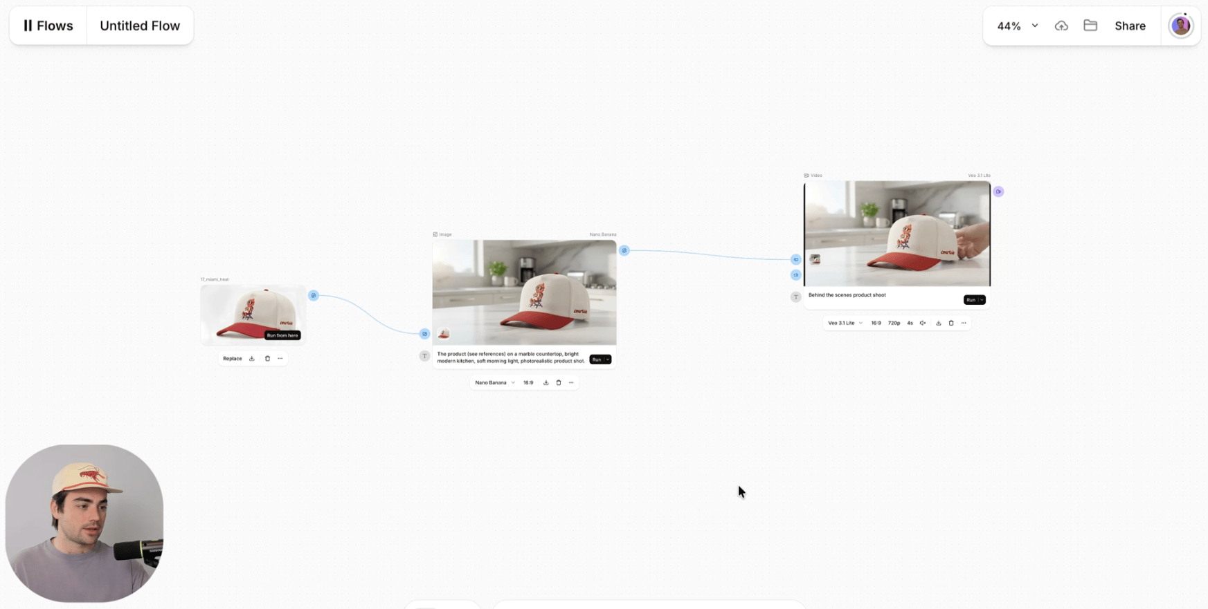Click Run on the video node > Run till here to generate an image and video in one go. Then, swap out image/video prompts, and quickly iterate on creatives