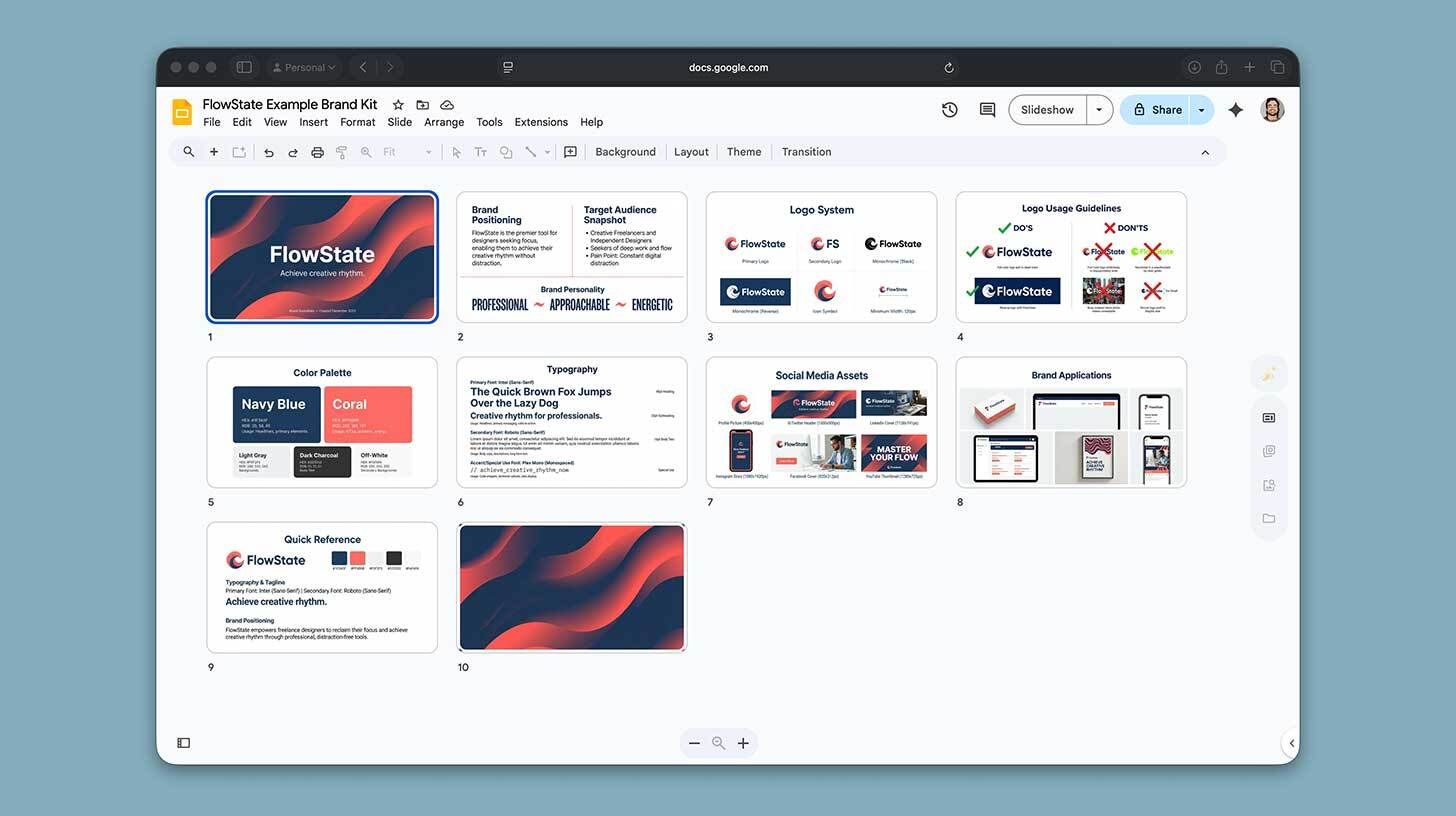 Prompt: "Generate the logo system slide for my brand kit deck," then ask it to outline remaining slides and generate each one at a time