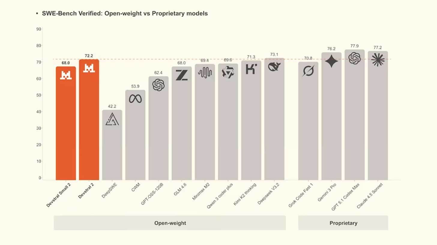 Why it matters: Mistral is shipping this month, with a strong Devstral release coming just days after the Mistral 3 launch. While the main model moves near the open frontier for coding, the small variant looks to be a real development upgrade for models able to be deployed locally and offline on consumer devices.