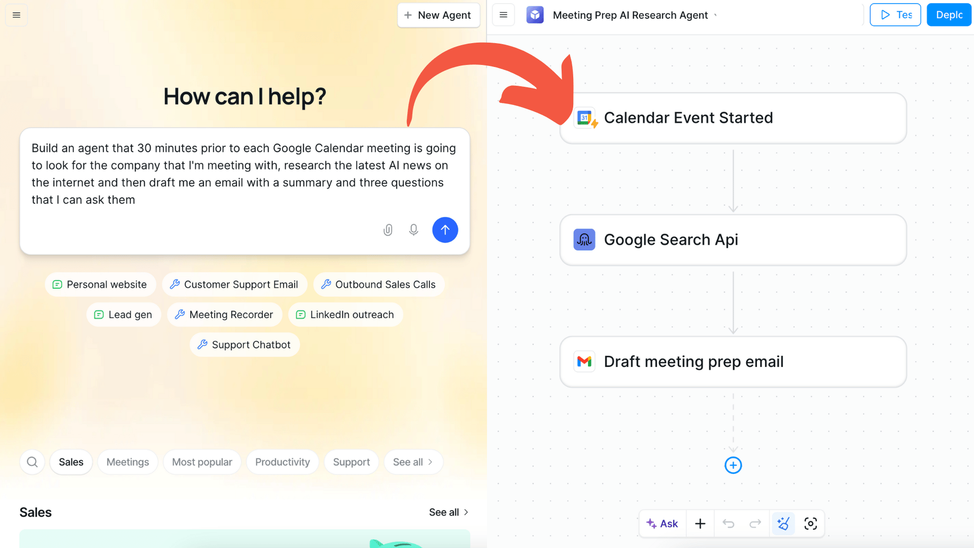 Test your agent with a sample meeting, then click “Deploy” to activate for all future calendar events